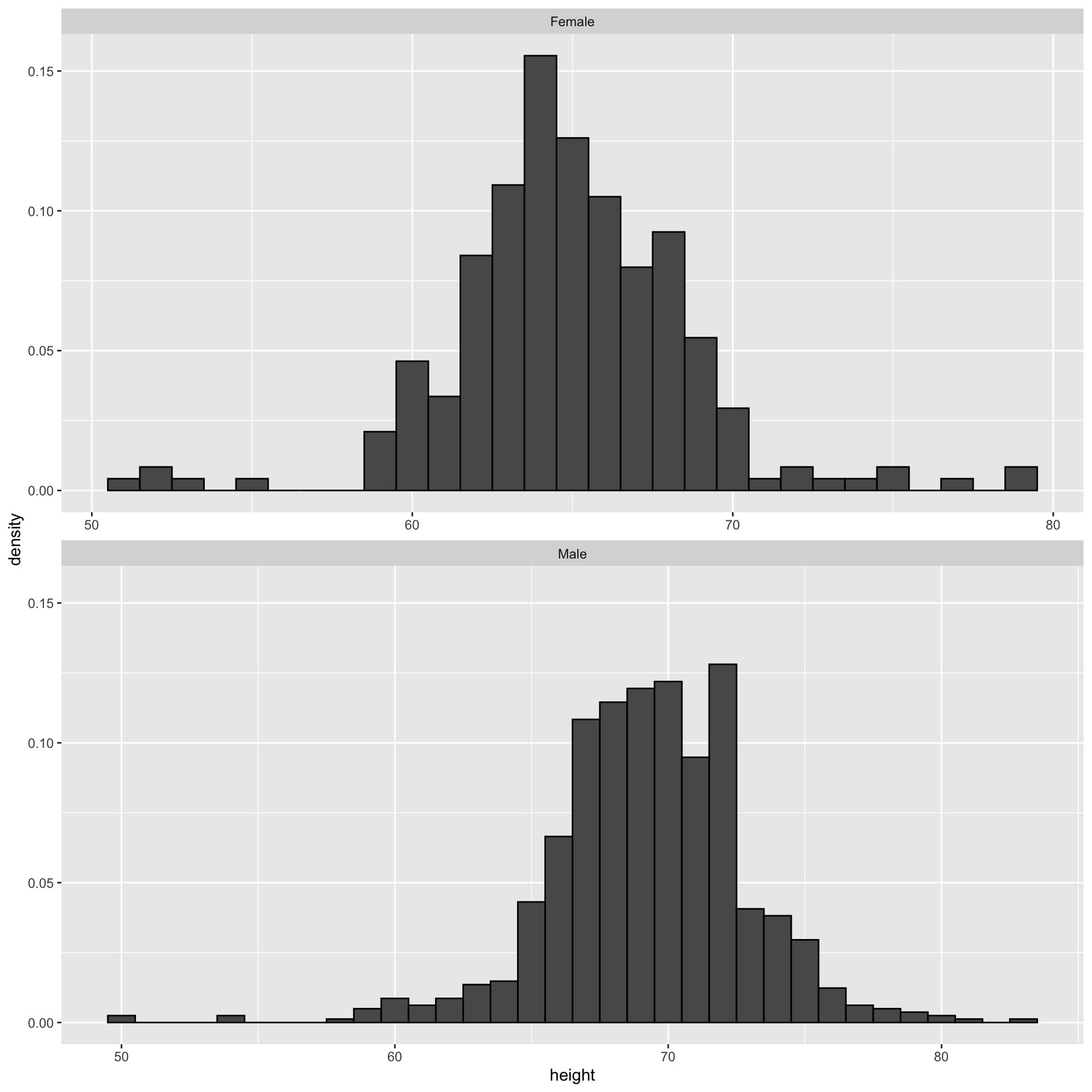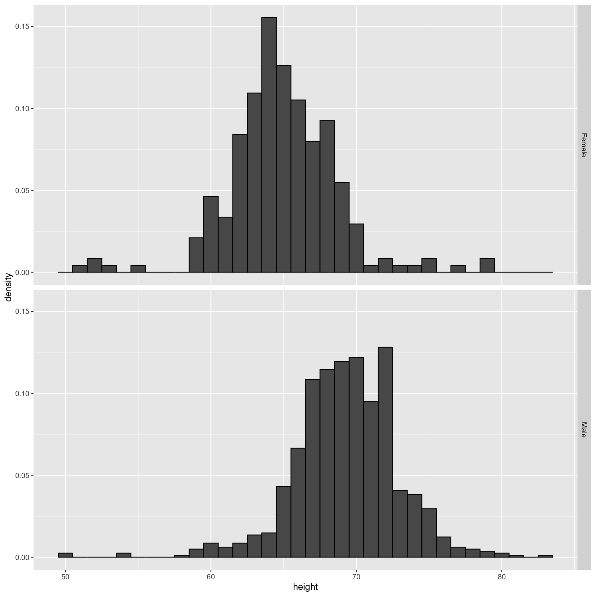 Since there are so many points, it is more effective to show distributions rather than individual points. We therefore show histograms for each group: