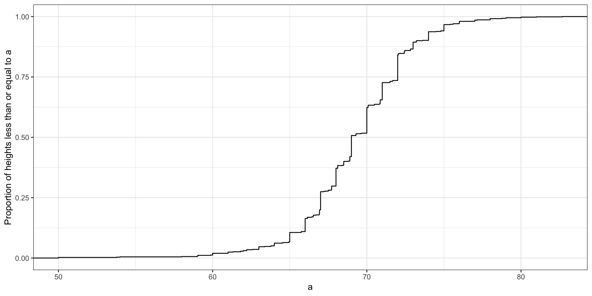 A more useful way to define a distribution for numeric data is to define a function that reports the proportion of the data below \(a\) for all possible values of \(a\).