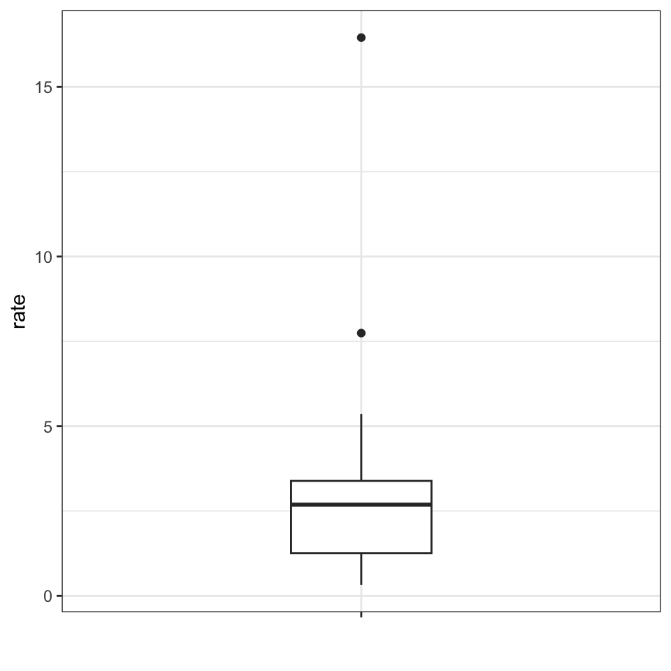 The boxplot provides a five-number summary composed of the range (the minimum and maximum) along with the quartiles (the 25th, 50th, and 75th percentiles).