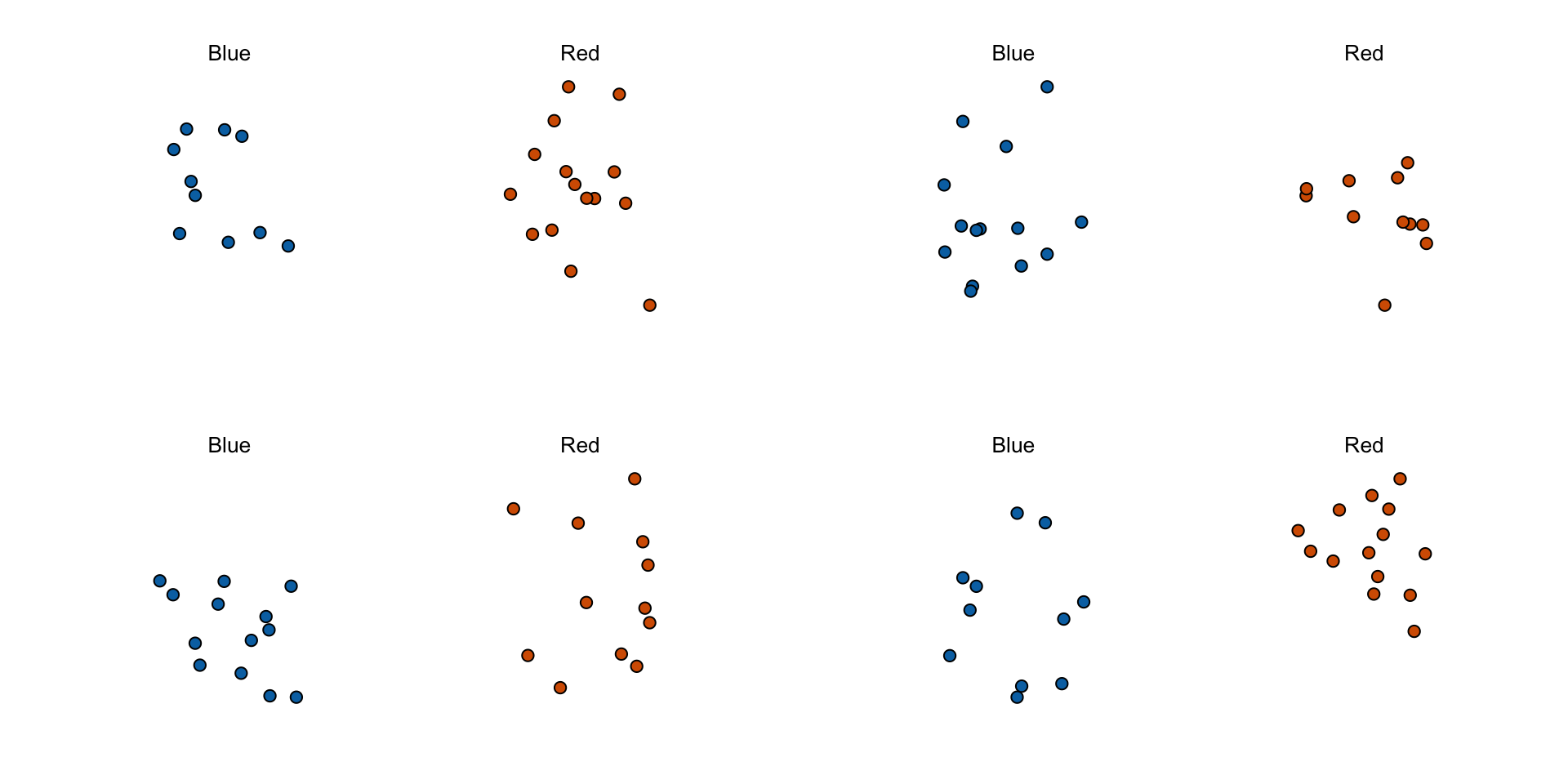 For example, given that we see 13 red and 12 blue beads, it is unlikely that \(p\) > .9 or \(p\) < .1.