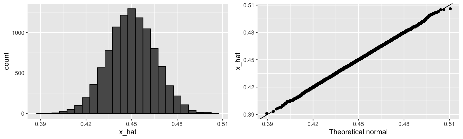 To review, the theory tells us that \(\bar{X}\) is approximately normally distributed, has expected value \(p=\) 0.45, and standard error \(\sqrt{p(1-p)/N}\) = 0.0157321.