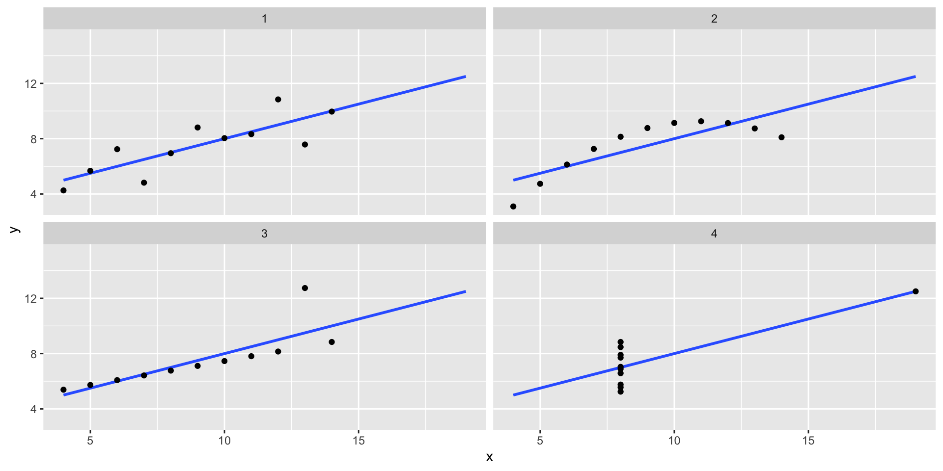 The following four artificial datasets, referred to as Anscombe’s quartet, famously illustrate this point.