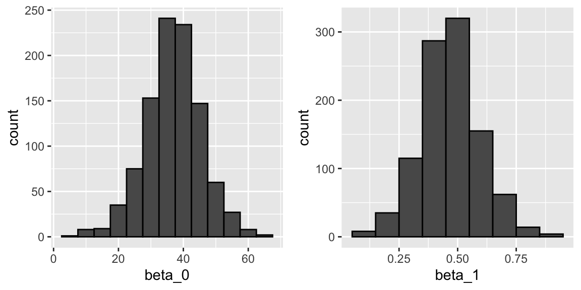 The reason these look normal is because the central limit theorem applies here as well: for large enough \(N\), the least squares estimates will be approximately normal with expected value \(\beta_0\) and \(\beta_1\), respectively.