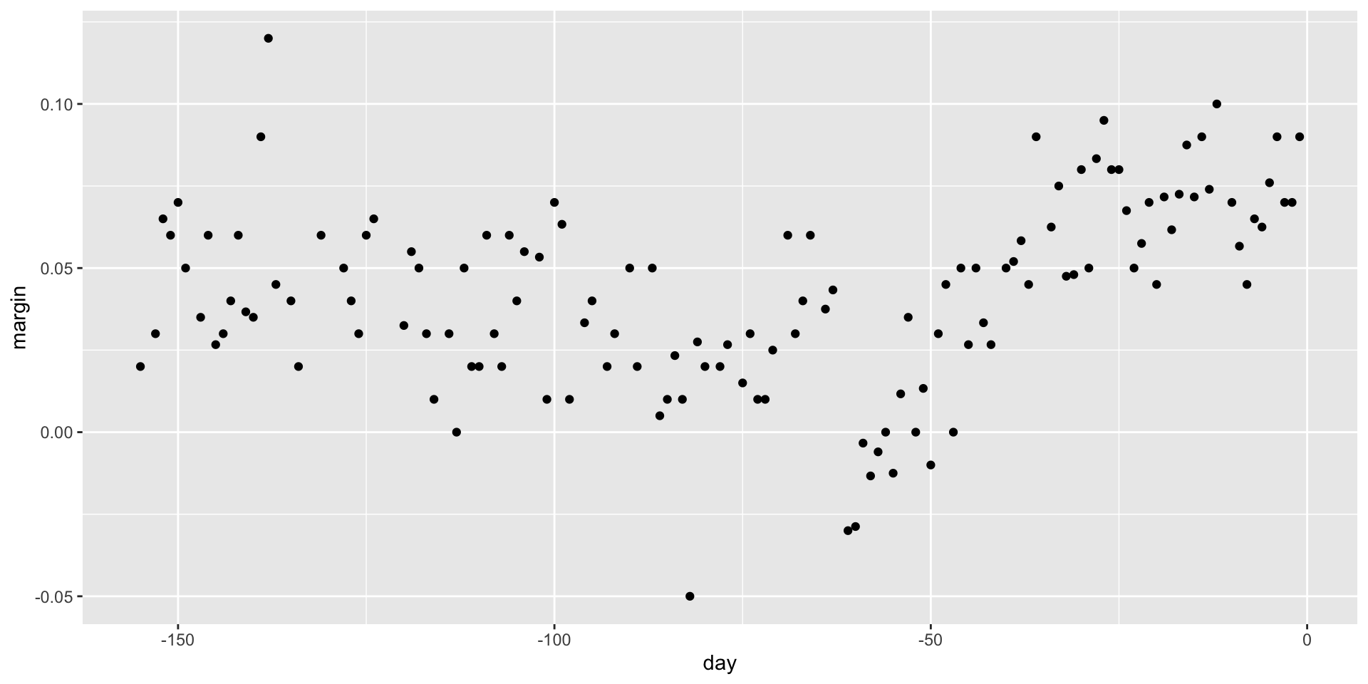 An example of this idea for the poll_2008 data is to assume that public opinion remained approximately the same within a week’s time.