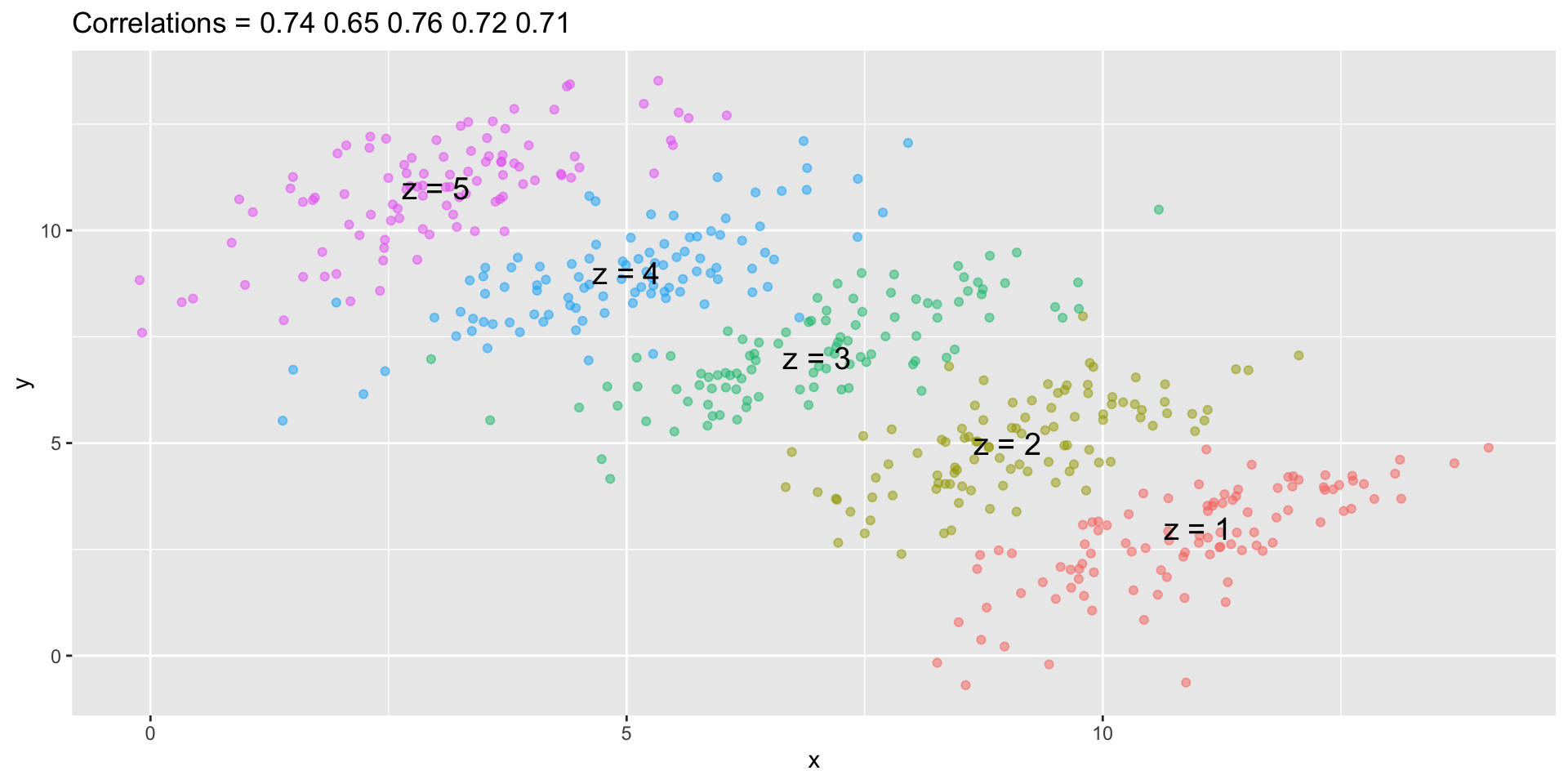 If we stratify by \(Z\), the \(X\) and \(Y\) are actually positively correlated, as seen in the plot above.