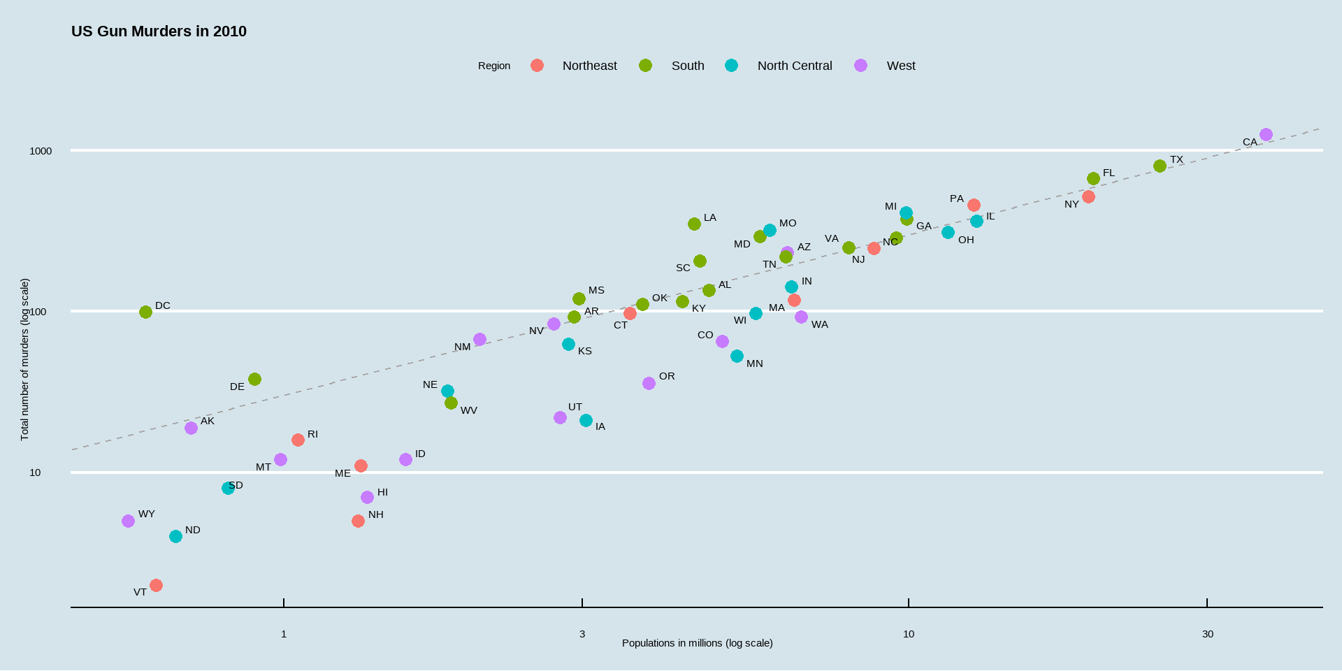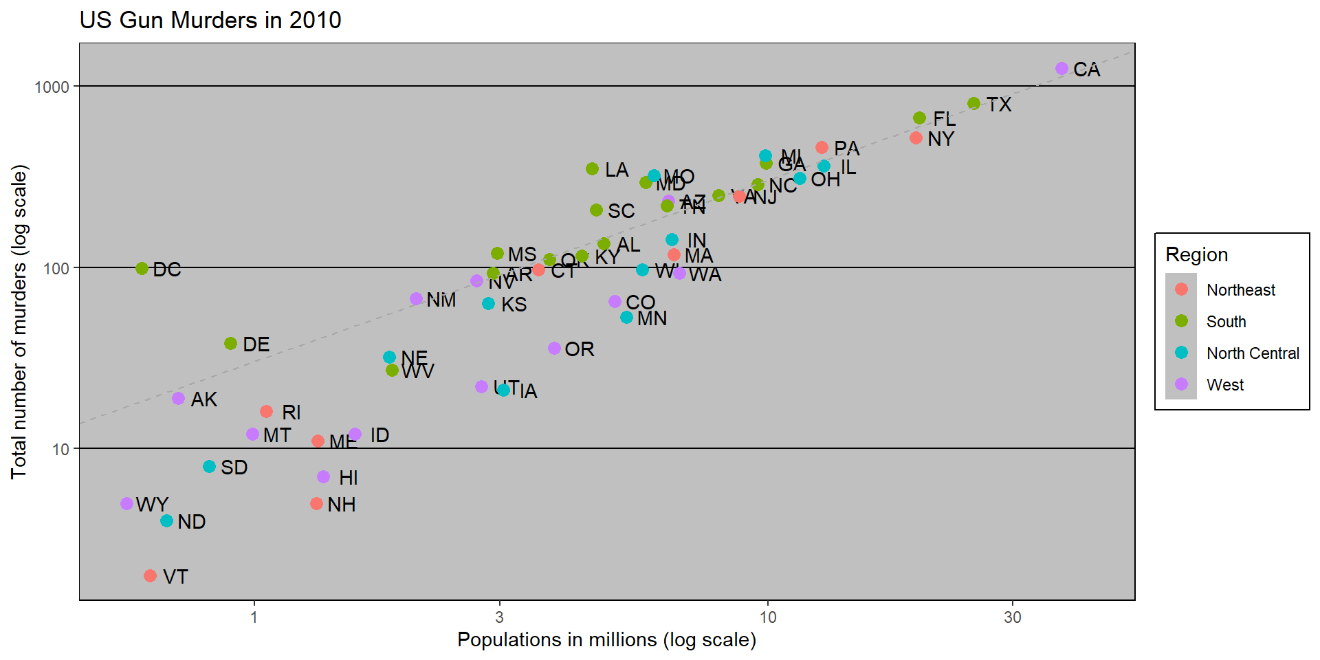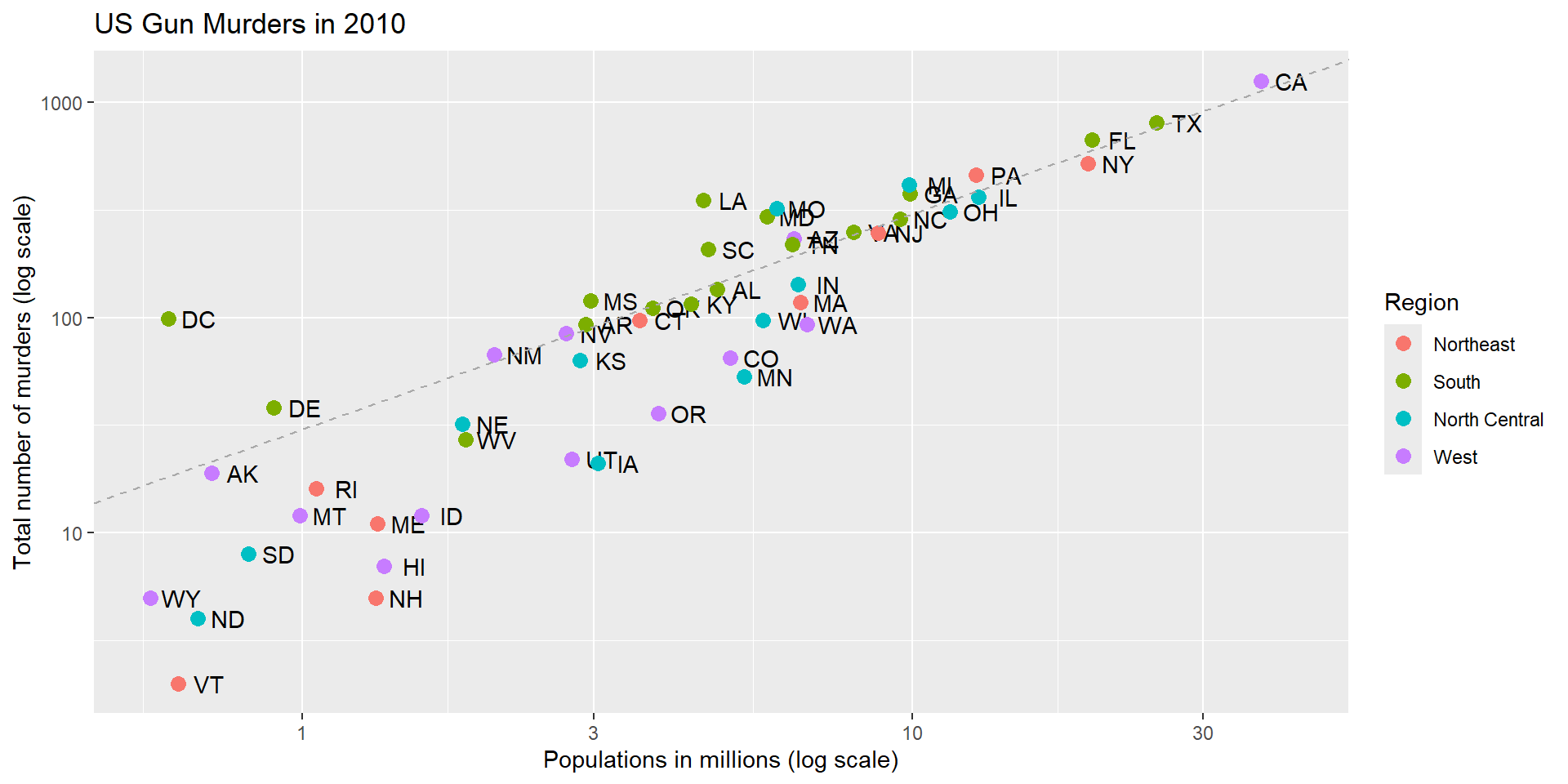 geom_abline(intercept = log10(r), lty = 2, color = "darkgrey")p and add layers.p <- murders |> ggplot(aes(population/10^6, total, label = abb)) +