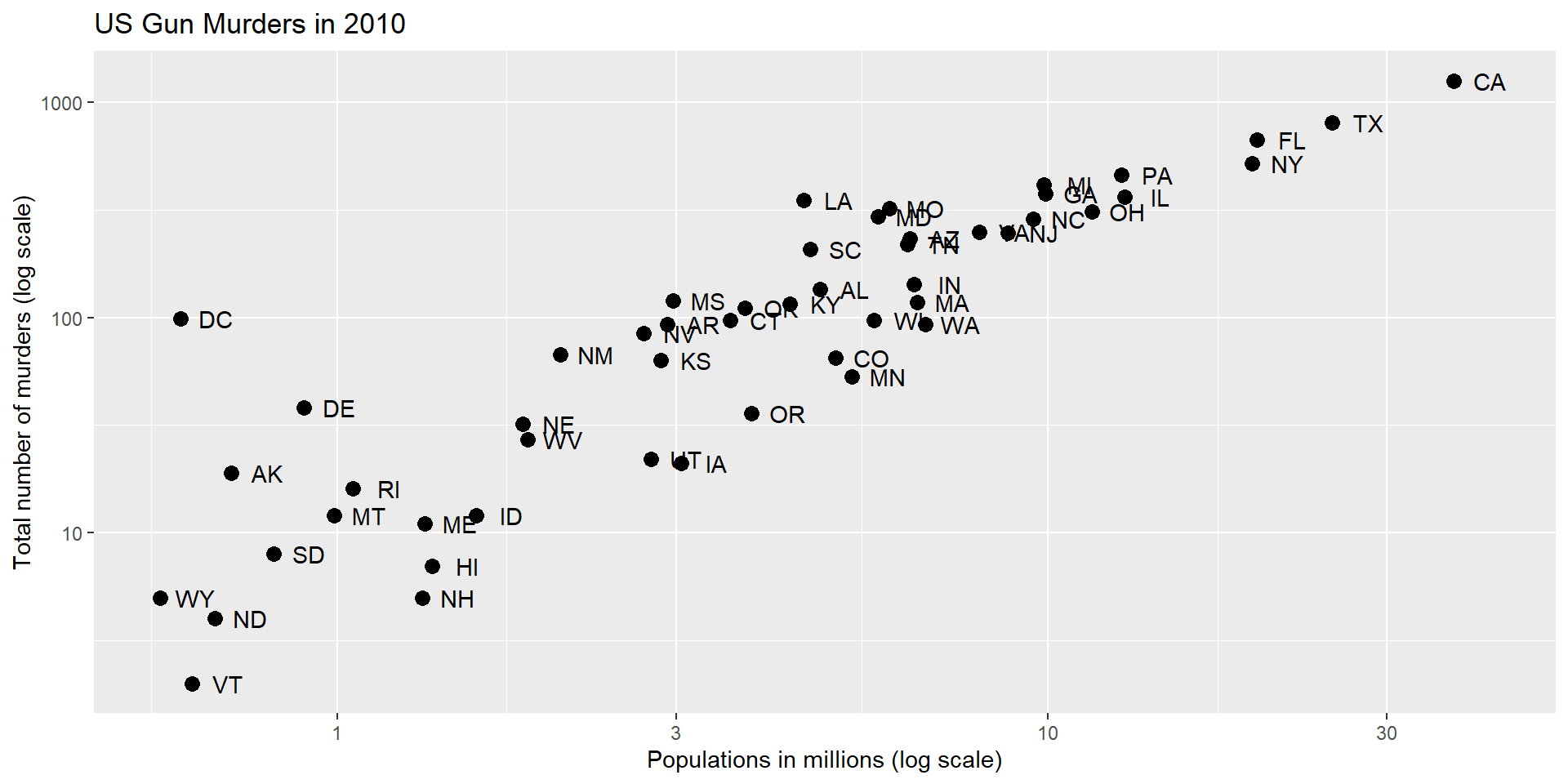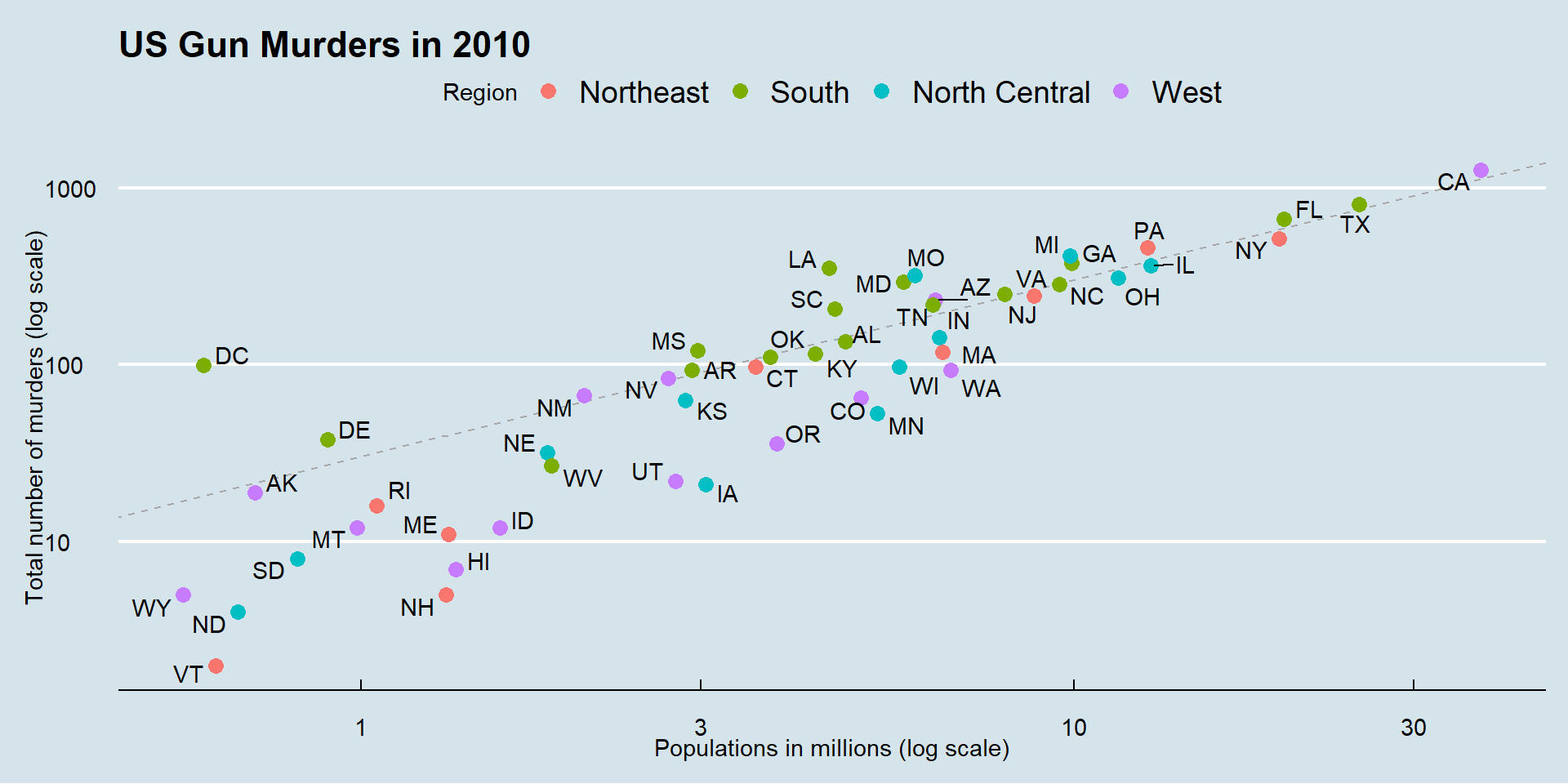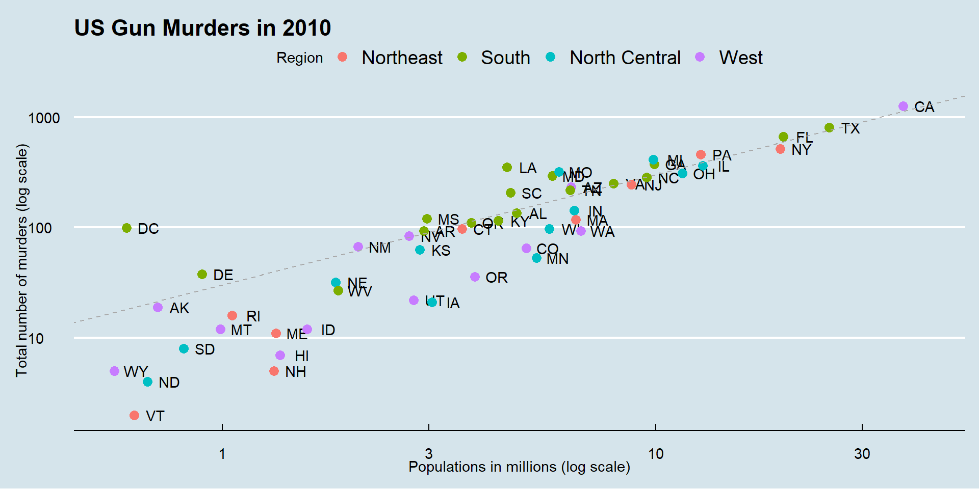 geom_abline(intercept = log10(r), lty = 2, color = "darkgrey")p and add layers.p <- murders |> ggplot(aes(population/10^6, total, label = abb)) +