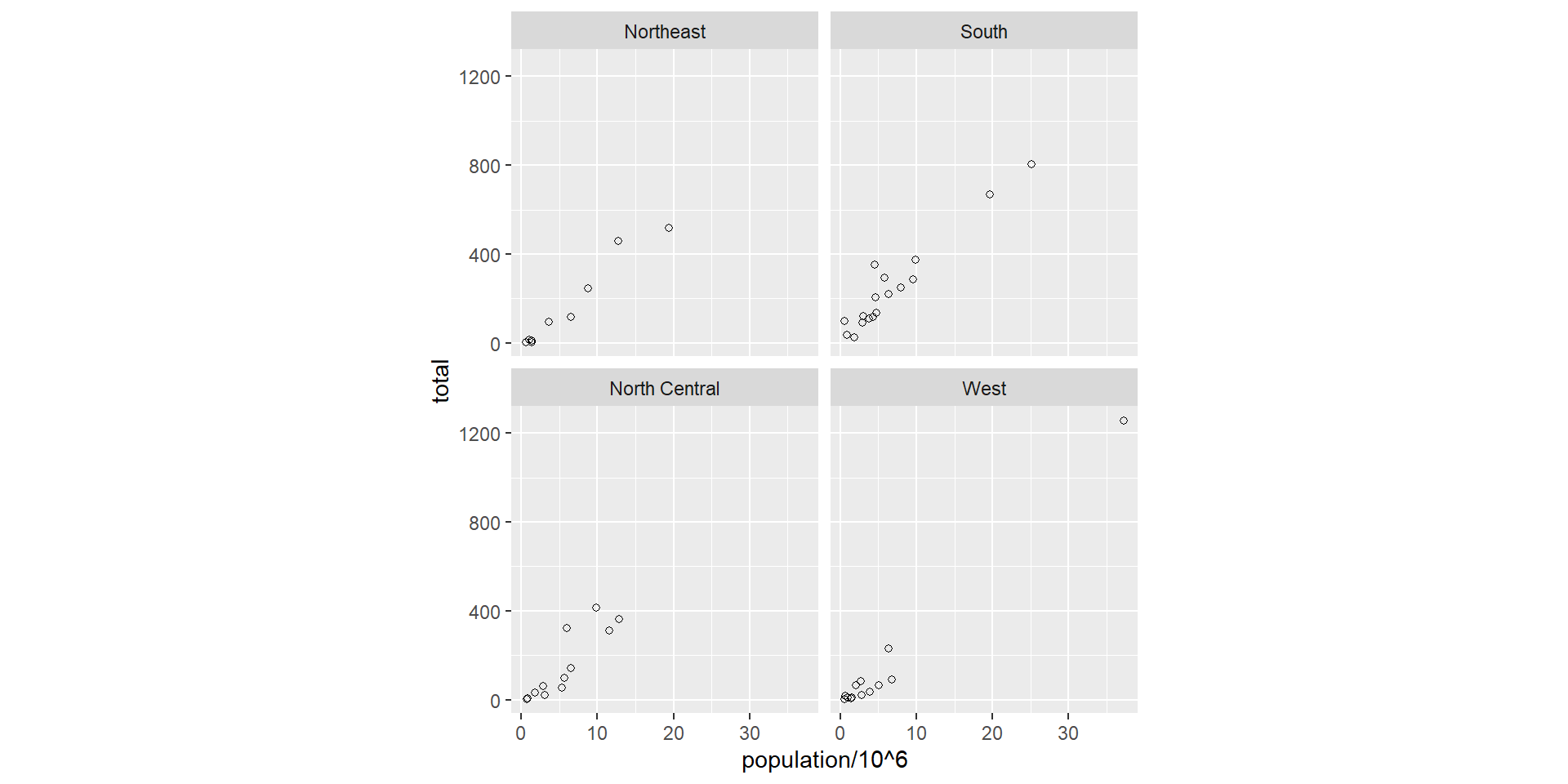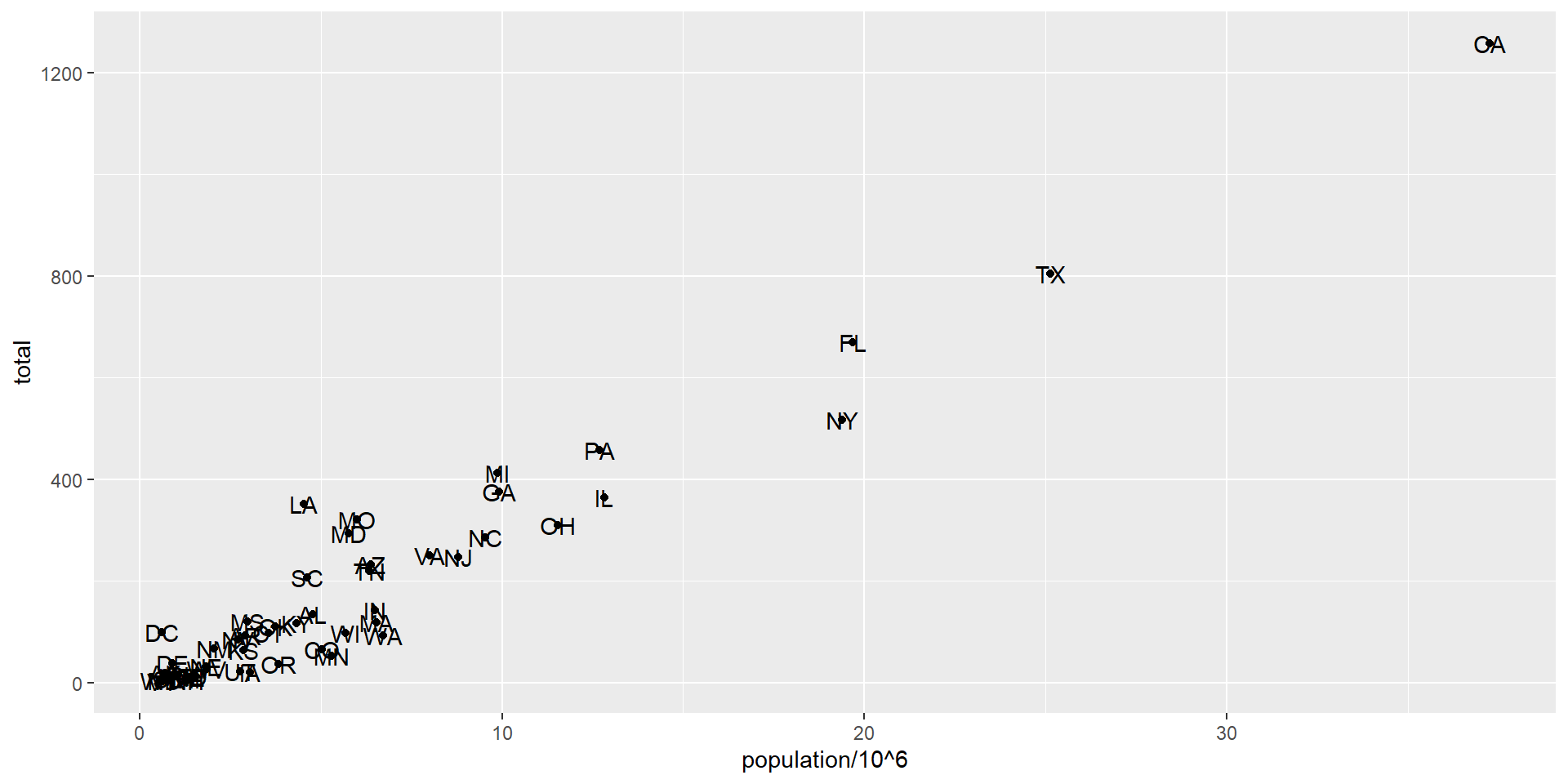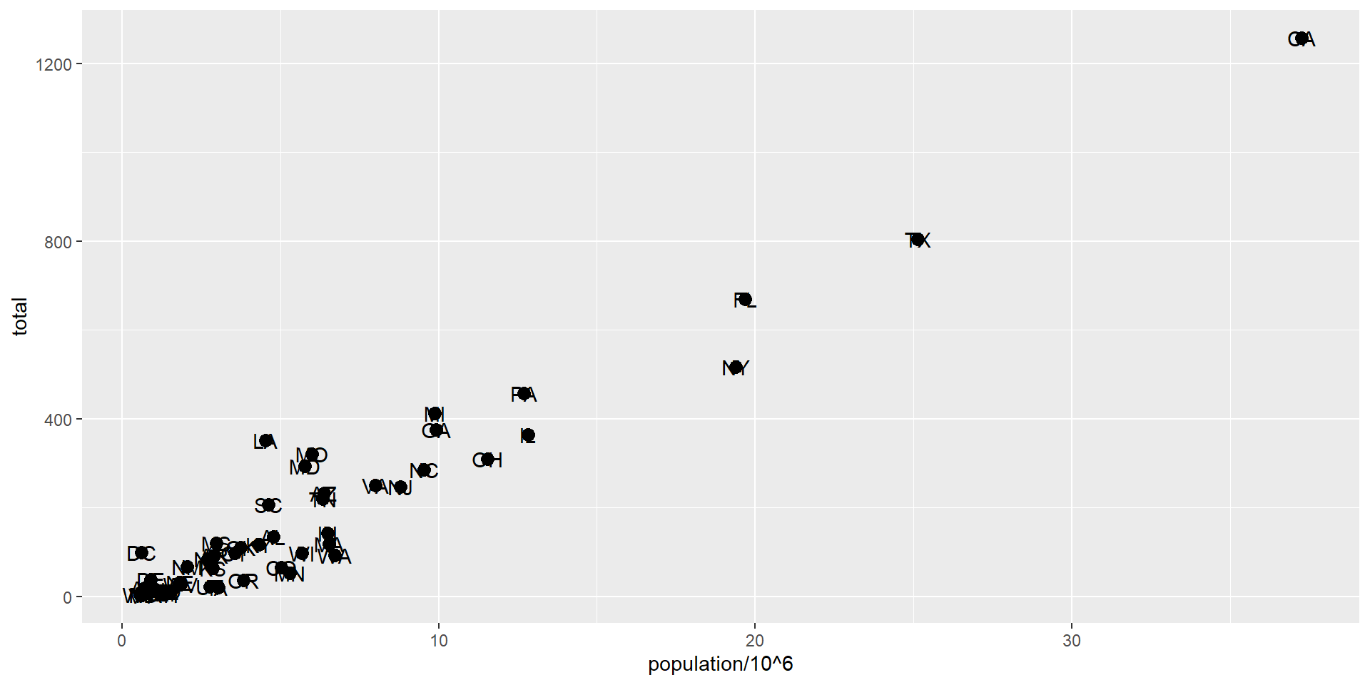 murders |> ggplot(aes(population/10^6, total, label = abb)) +