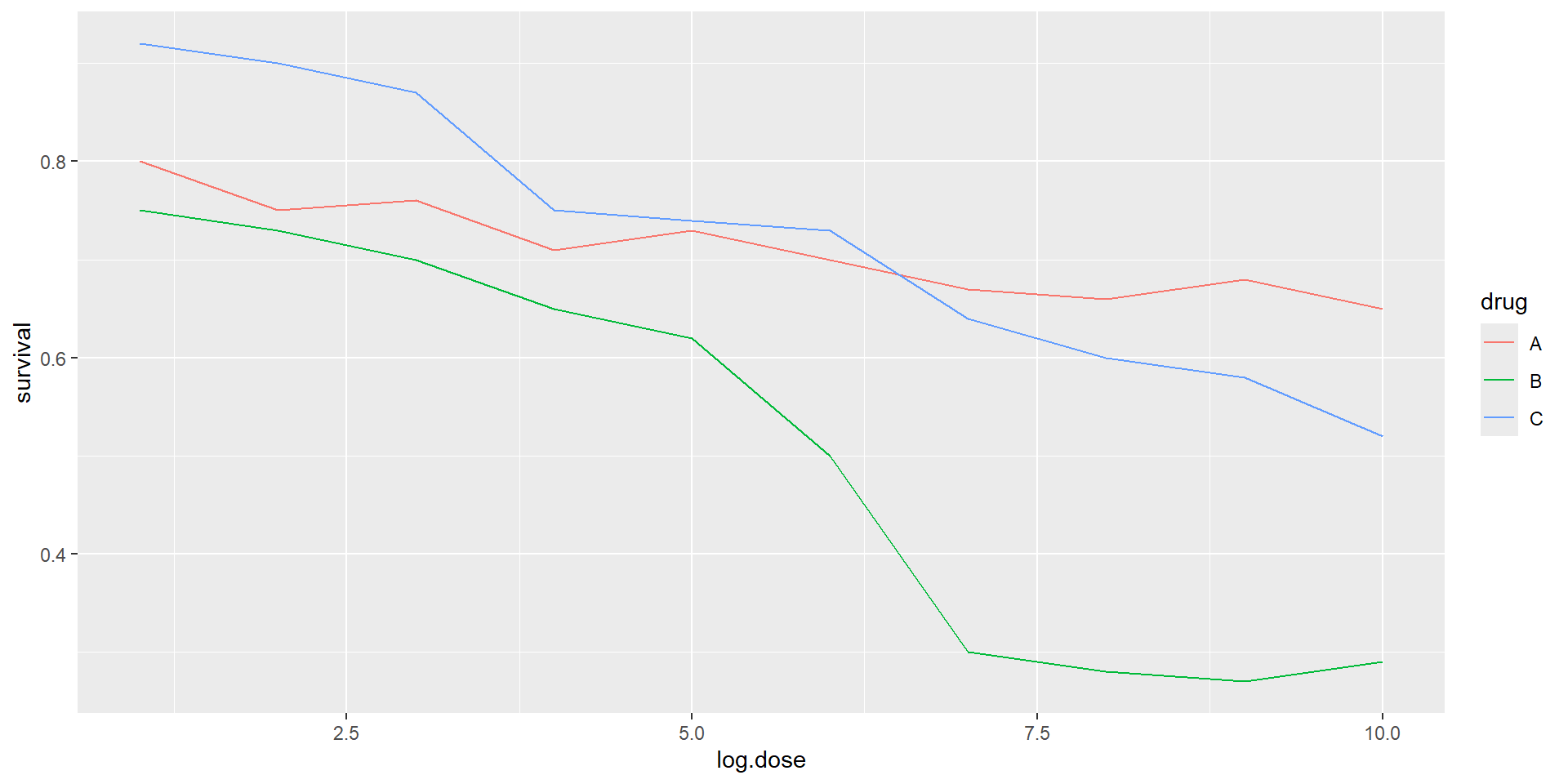 The figure below, taken from the scientific literature, shows three variables: dose, drug type and survival: