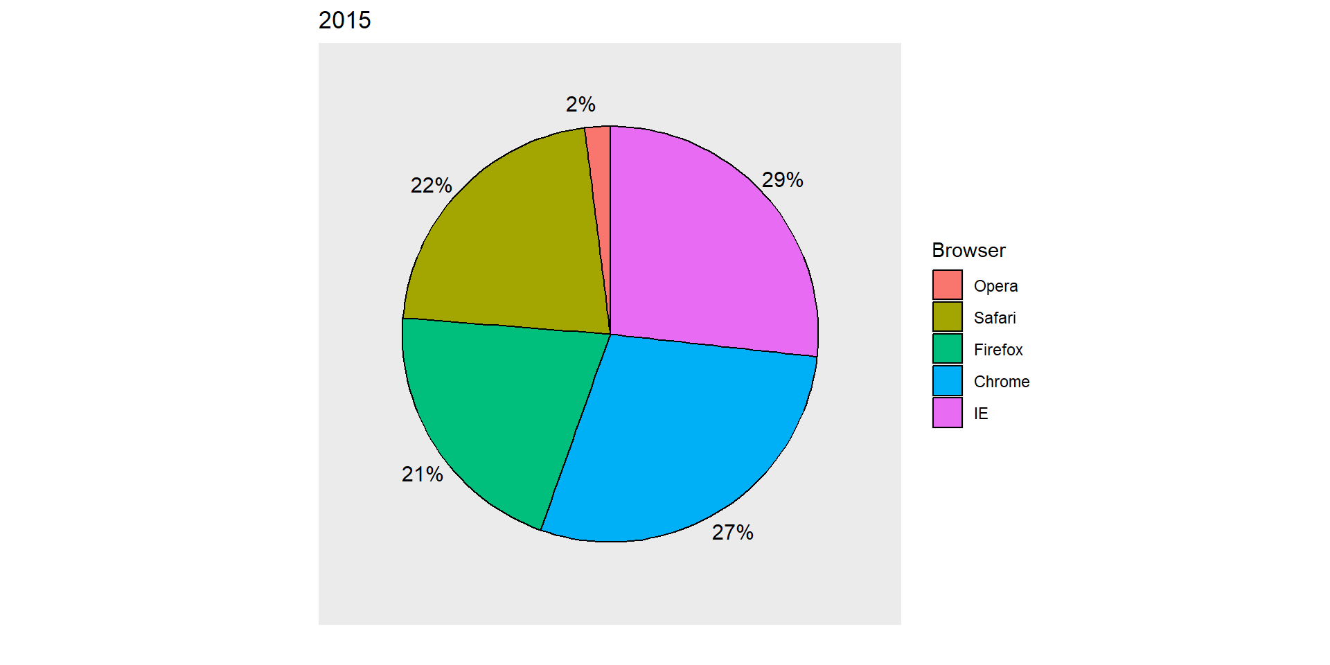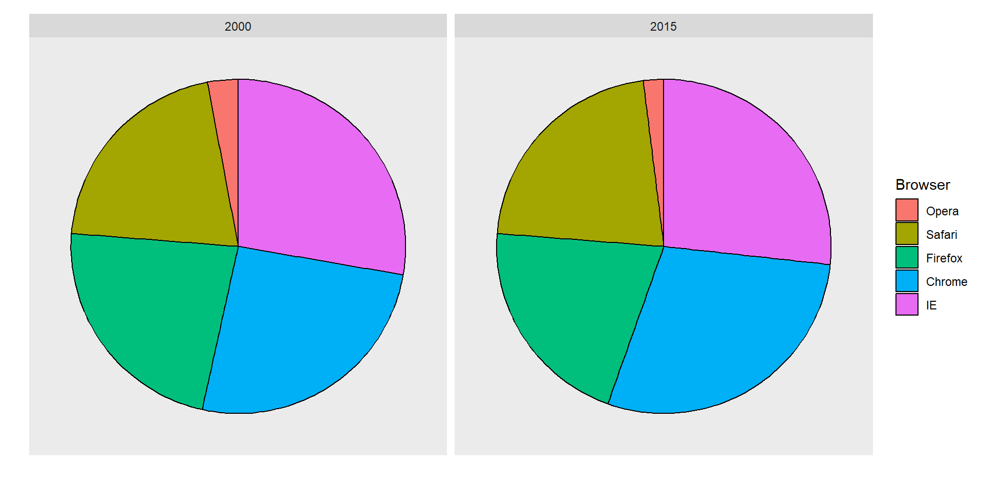 For each year, we are simply comparing five quantities – the five percentages for Opera, Safari, Firefox,IE, and Chrome.