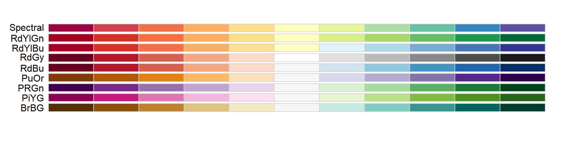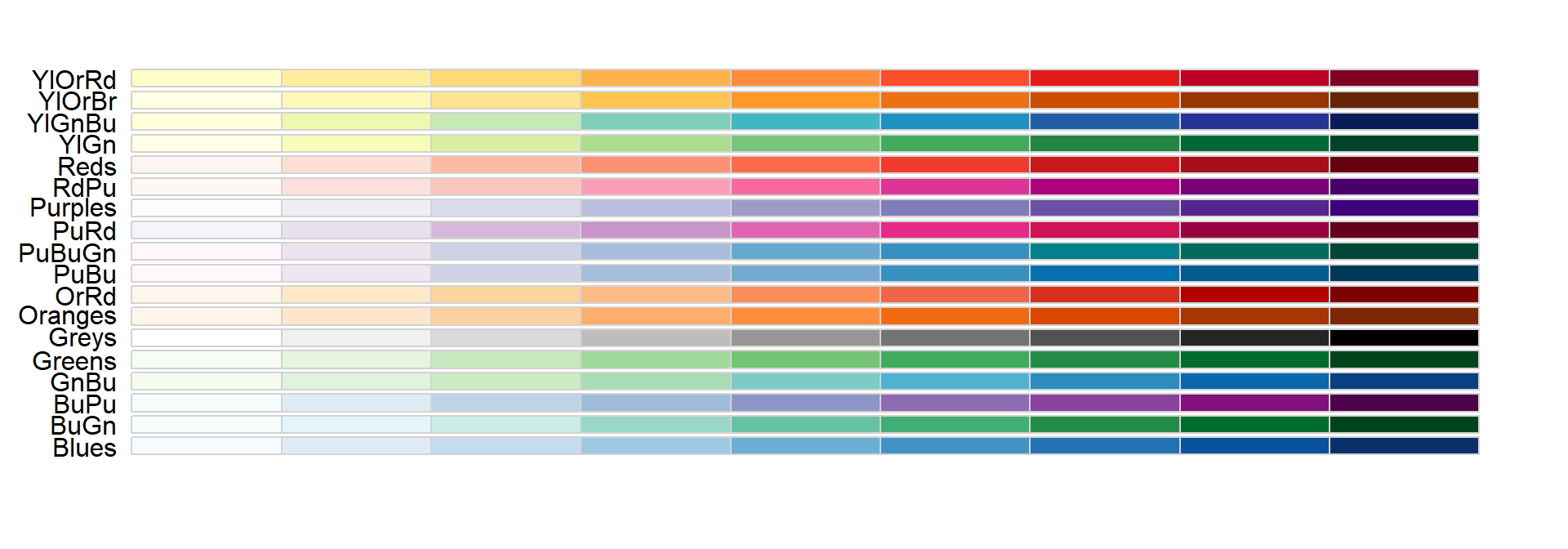 Sequential colors are suited for data that goes from high to low. High values are clearly distinguished from low values. Here are some examples offered by the package RColorBrewer: