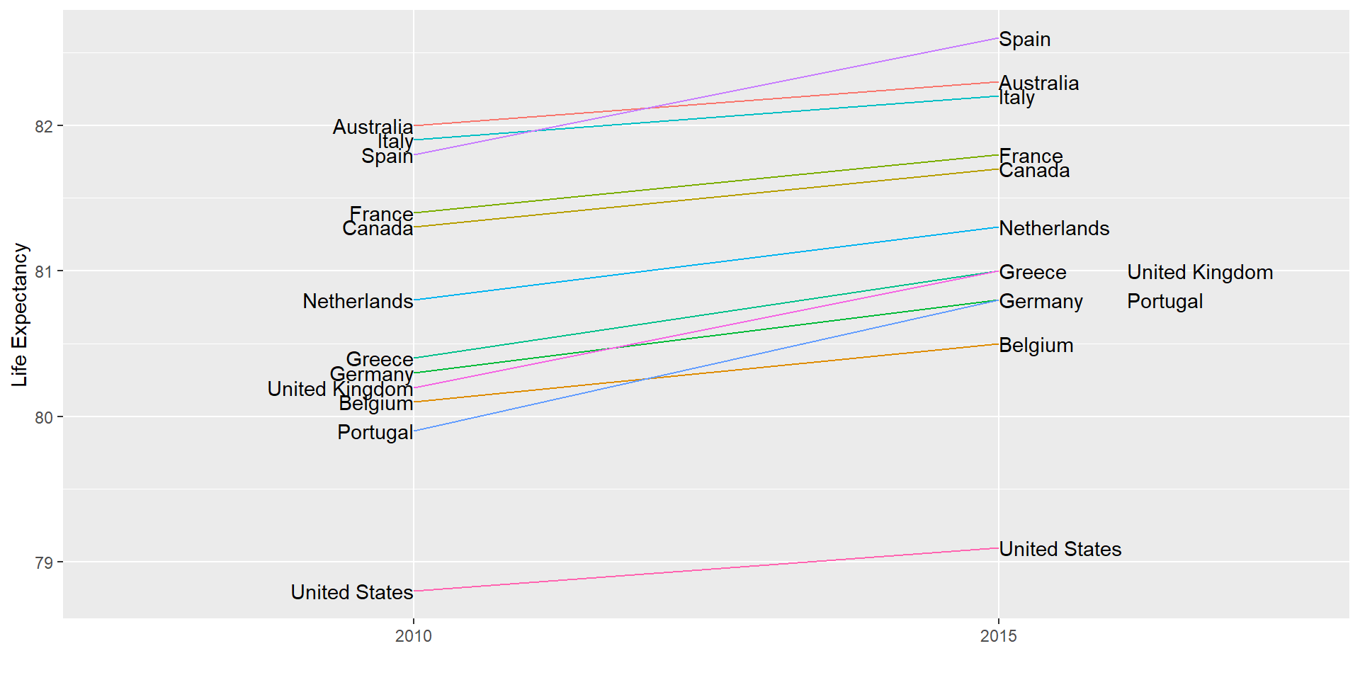 Slope charts adds angle as a visual cue, useful when comparing two groups and each element across two variables, such as years.