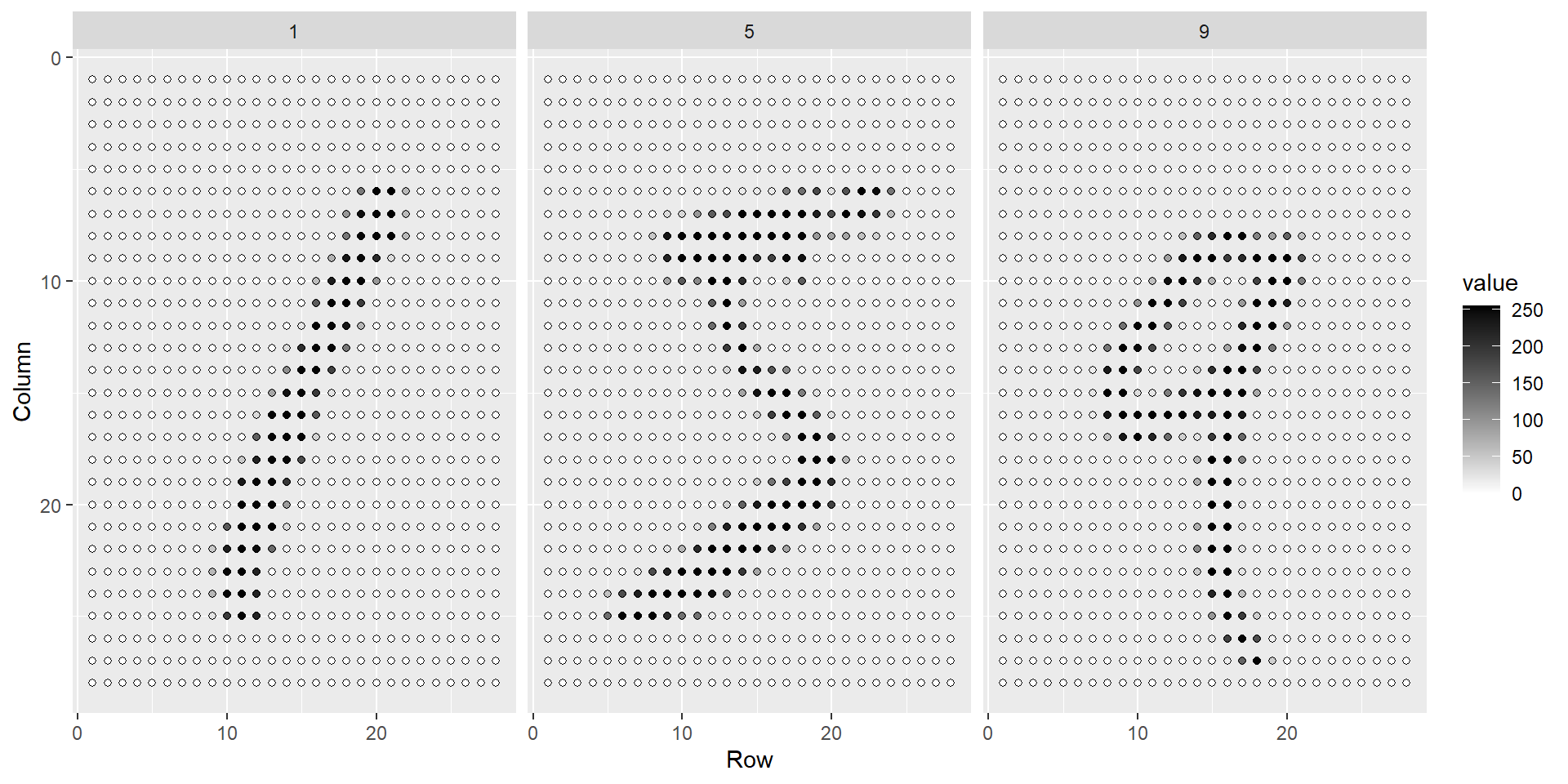 The third row of the matrix x[3,] contains the 784 pixel intensities.