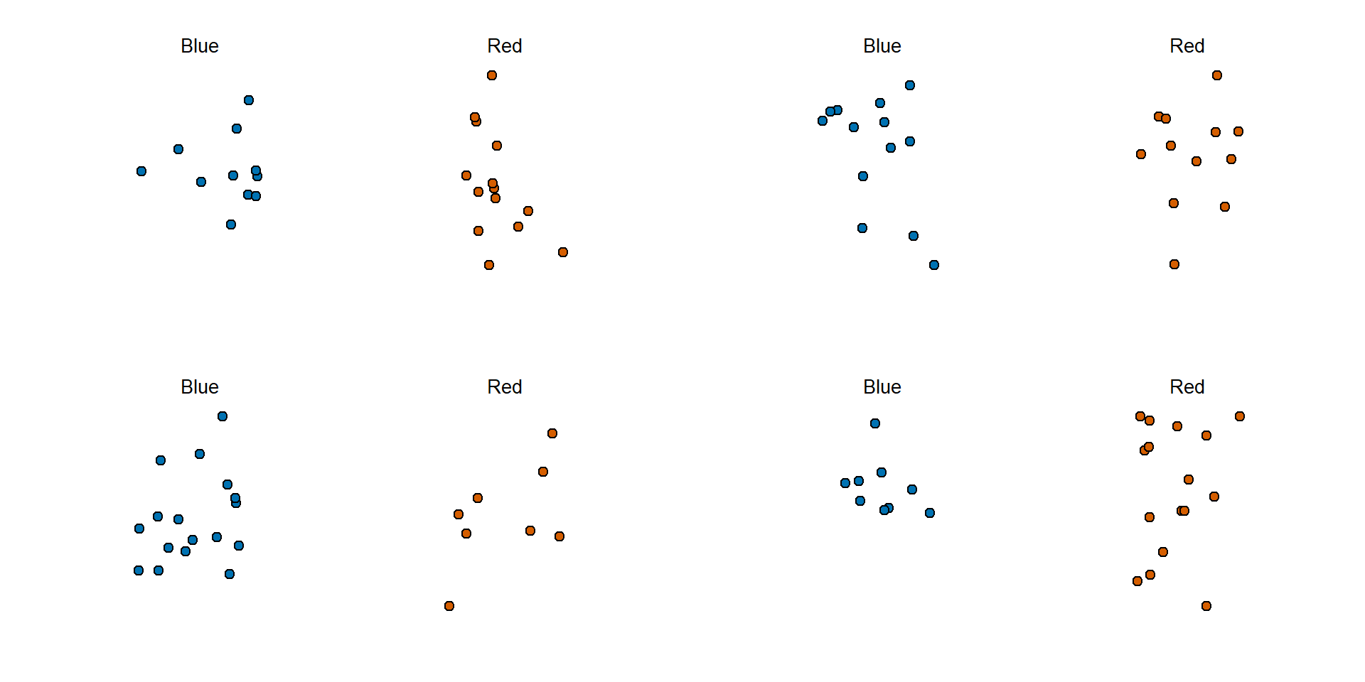 For example, given that we see 13 red and 12 blue beads, it is unlikely that \(p\) > .9 or \(p\) < .1.