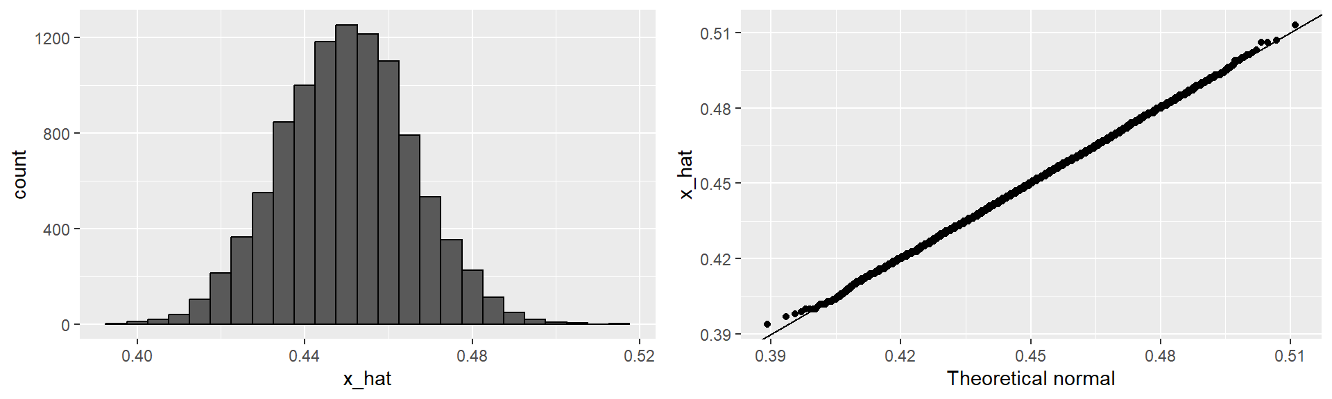 To review, the theory tells us that \(\bar{X}\) is approximately normally distributed, has expected value \(p=\) 0.45, and standard error \(\sqrt{p(1-p)/N}\) = 0.0157321.